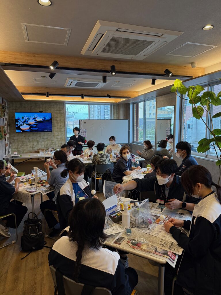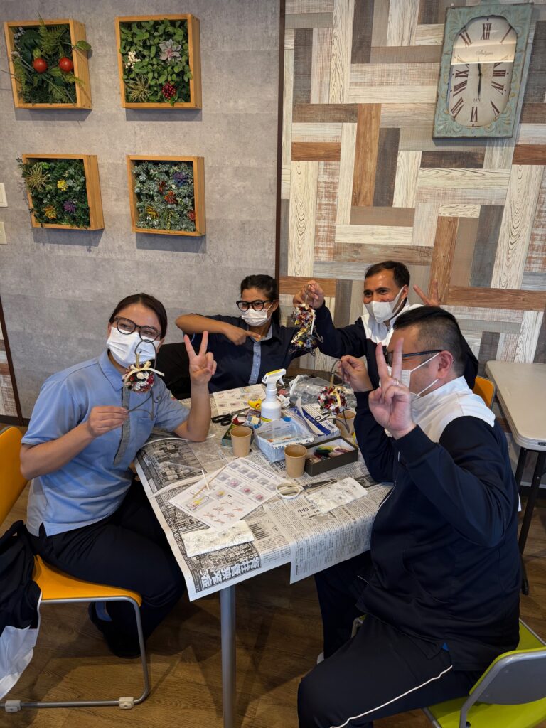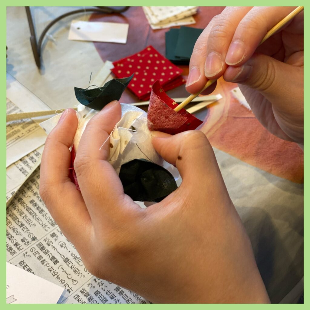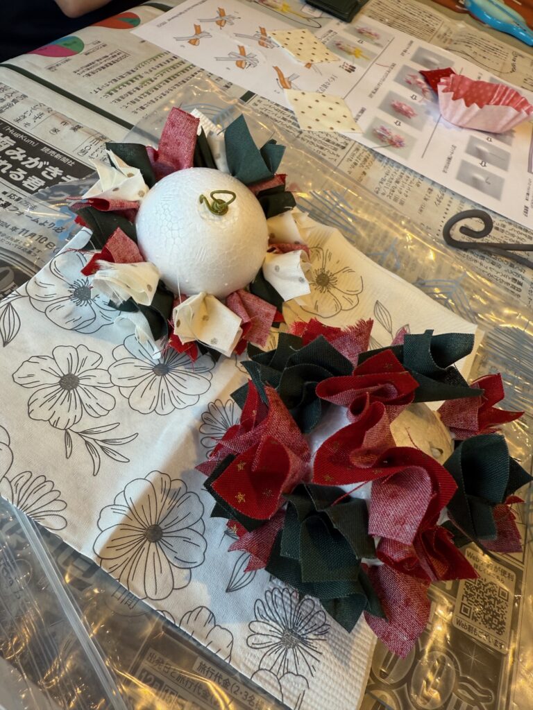 2025.12.08 「Xmas布ボールリース!」アロマクラフト教室 ・新入職員交流会🌹 新入職員との交流会は今回はXmas布ボールリース作り! 切れ端の布にボンドを付けて、ひたすら発泡スチロールに挿し込む! 皆さん作り方に個性があって・・笑いながらも素敵な作品ができました。