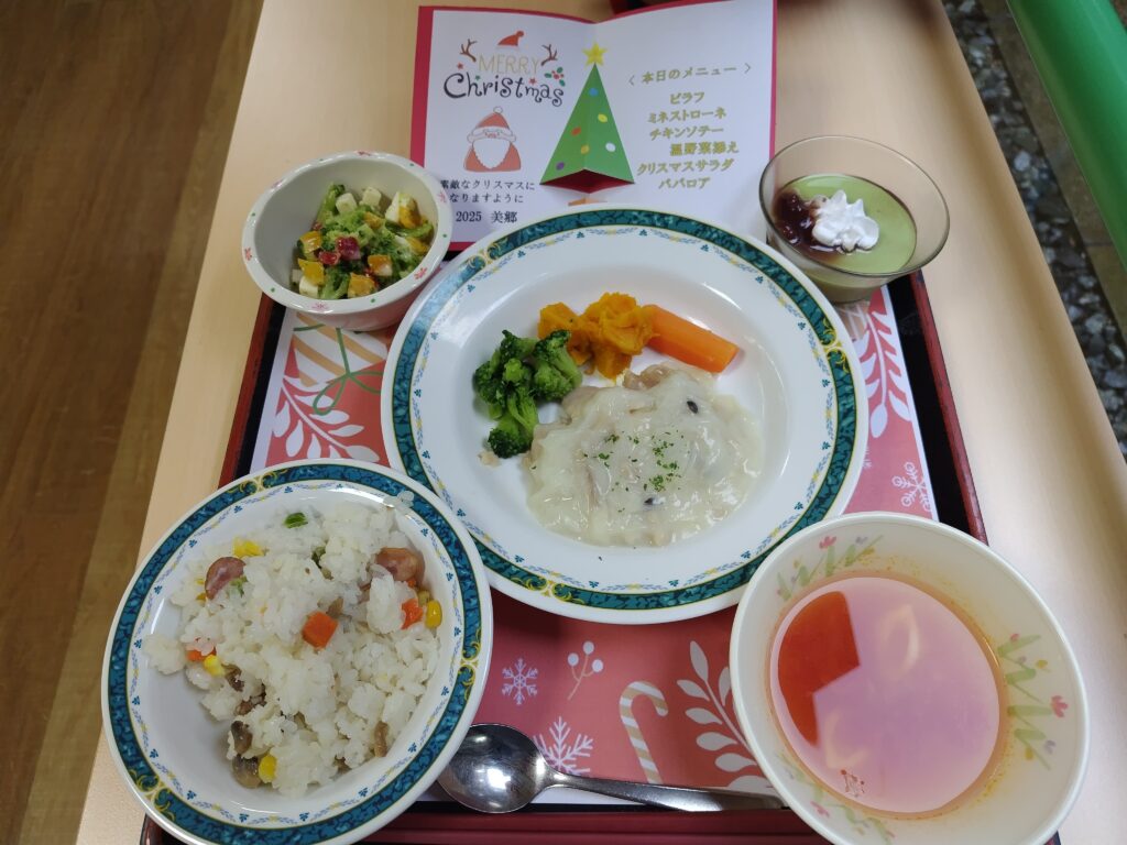 2025.12.24 🎅Xmas🎄昨日から、🍗柔らかくジューシーに焼き上げえるために下ごしらえを行い1枚、1枚、丁寧に焼き上げました🌠皆さん美味しく召し上がって頂けました☆彡 メニューのご紹介 1.チキンソテー 2.ピラフ 3.ミネストローネ 4.温野菜 5.クリスマスサラダ 6.ババロア
