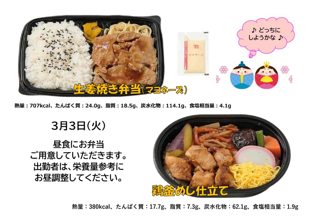 2026.02.26 職員への福利厚生🍱定期的に職員に対して法人より昼食やおやつ等を提供させて頂いております🌠3月3日のひな祭りの日に提供する職員のお弁当を本日、発注させて頂きました❕ 管理栄養士が職員の健康管理も留意してかつ、男性・女性どちらもご自身で選択してもらえるように配慮しております。