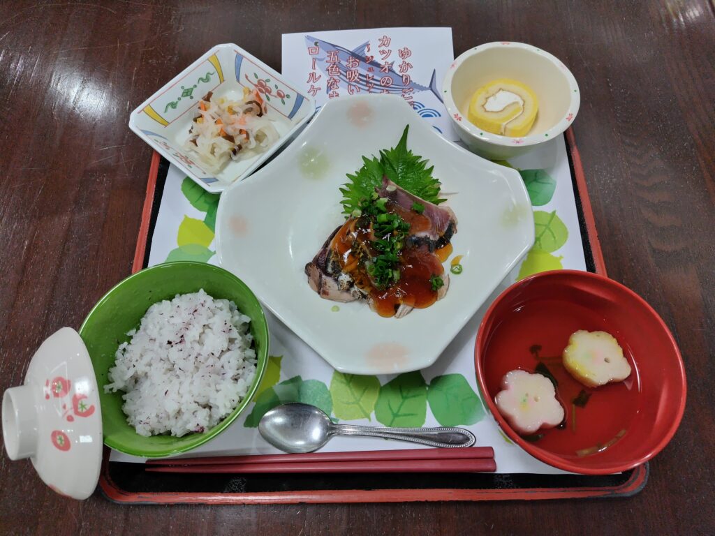 2026.04.24 🐟本日、昼食は今が旬🌠カツオのたたき特別膳を召し上がって頂きました❕皆様、とても美味しいと大好評でした。 メニュのご紹介・・・ゆかりご飯・カツオのたたき~ジュレソース~・お吸い物・五色なます・ロールケーキ
